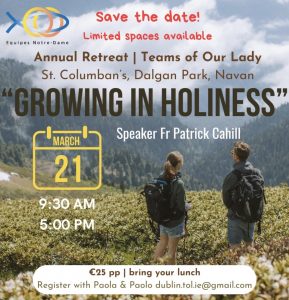 With great joy, we warmly invite you to the Teams of Our Lady Annual Retreat. The theme of the retreat is “Growing in Holiness” and we are delighted to welcome Fr. Patrick Cahill as our speaker.